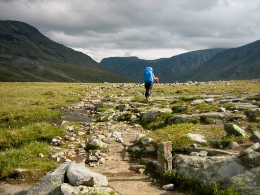 Onze rugzakken – gevuld met kampeerspullen en proviand voor 6 dagen – wegen een ton en de eerste kilometers gaan dan ook langzaam. We starten tussen een begroeid landschap tussen de struiken van het Storadal en volgen de Storae-rivier.