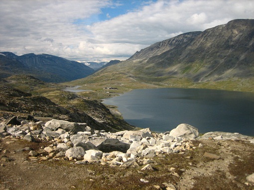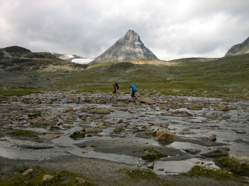 De laatste dag van onze zesdaagse trektocht breekt aan. Na een verkwikkende nacht en ditto ontbijt (!!!) merken we dat onze kleren niet helemaal droog zijn geraakt na de natte tocht van gisteren. Maar vandaag lijkt een zonnige dag te worden en we maken ons klaar om de meest bekende tocht van Jotunheimen aan te vatten.