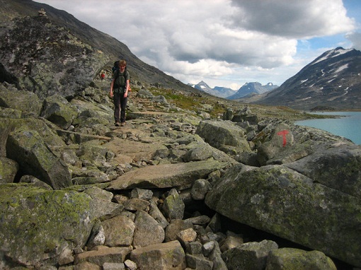 We passeren de hut van Leirvassbu en vervolgen de weg tussen de grote rotsblokken langs het meer. Het vraagt nogal wat evenwicht om met de zware rugzakken van rots tot rots te klauteren. De wandelstokken hangen meer in de weg dan wat anders.