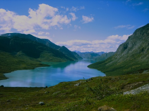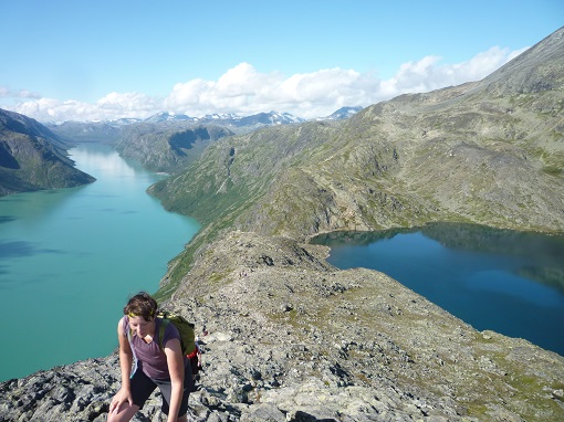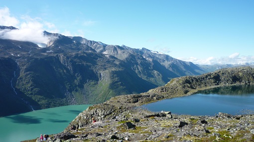 Het meest schitterende uitzicht ervaren we wanneer we ons tussen twee meren in bevinden: Gjende, dat groen kleurt, en Bessvatnet, dat blauw kleurt en 400 meter hoger ligt.