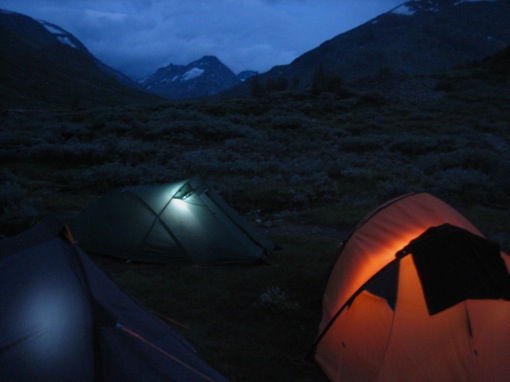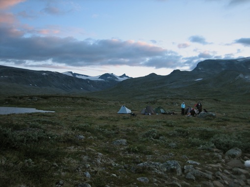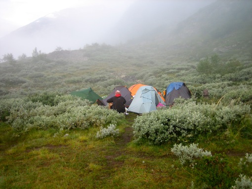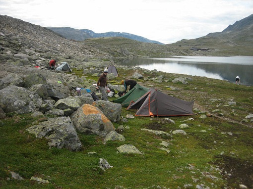 Op een halve kilometer voor de hut stoppen we en met onze laatste krachten slaan we onze tentjes op aan de rand van een ijskoud meer, Leirvatnet. Aanvankelijk zouden we voorbij het meer overnachten, maar dat halen we echt niet meer. We zetten de tenten op en eten meteen onze meest zware voedingswaren op, zodat de rugzak morgen toch al iets lichter is.