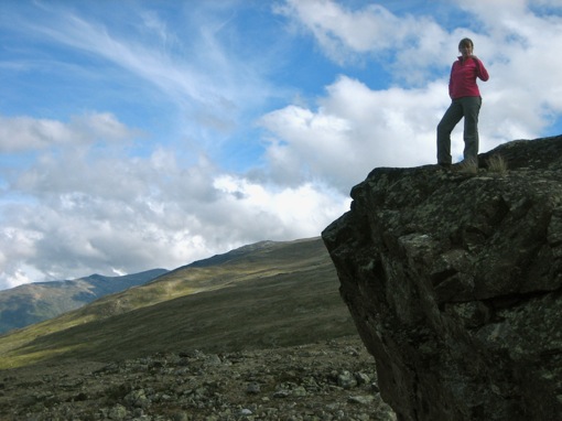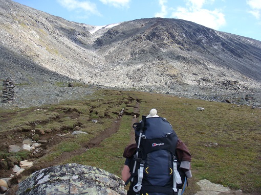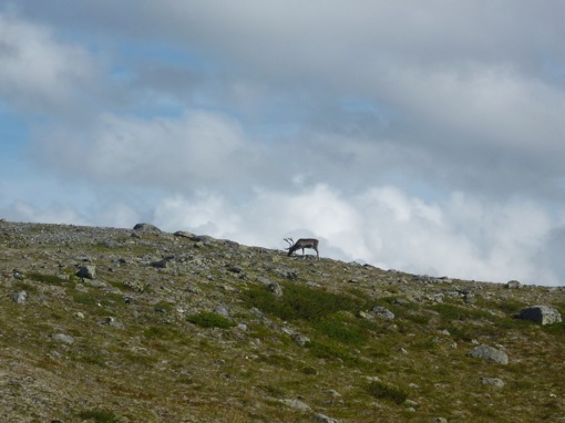 Na een pittige kuitenbijter door wat lage vegetatie moeten we algauw kiezen of we over, dan wel om de berg heen hiken. Ik had me voorgenomen de volledige trekking te lopen zoals gepland, maar wil toch bijna kiezen voor the easy way omdat mijn benen redelijk op zijn. Maar dan passeert er een knullig rendier wat voor een prettig zicht zorgt en zie ik dit als een teken om toch door te bijten. Samen met Wim besluit ik om toch de berg te beklimmen.