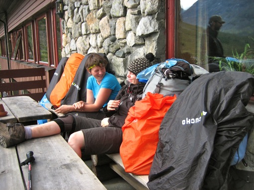 Na het zwemmen verzorgen we de blaren (Karlien heeft een kanjer van een blaar op haar voetzoel, de foto’s besparen we u) en koken we allen onze avondmaaltijd in het schuilhutje van de camping (voor ons een mislukte oplospuree met parmesaan en zwanworsten, bah!).We zoeken de gezelligheid van de hut op, waar een lokale gids uitleg geeft over de beklimming van de Galdhoppigen. Sommigen onder ons zien de beklimming niet zitten en schrijven zich nog snel in voor een gletsjertocht. Wanneer we in de warme slaapzakken kruipen besluiten we dat deze tweede dag al bij al veel beter meeviel dan de eerste wandeldag.