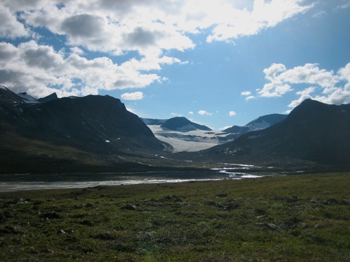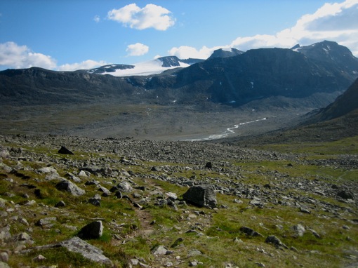 We volgen het pad, steeds recht door en moeten af en toe een gletsjerstroom oversteken. Na enkele kleinere stroompjes, steken we de Hällstuguåen over via de zomerbrug.