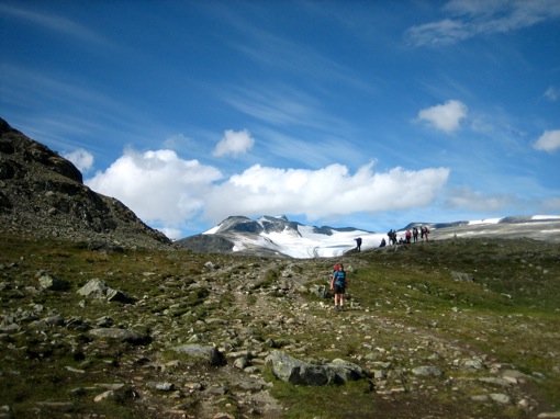 Aan de tenten nemen we afscheid van de overige vrienden die vertrekken voor de beklimming van de Galdhoppigen, terwijl wij ons klaarmaken voor ons eigen avontuur. We verzamelen bij de gidsen aan de hut en vertrekken met een tiental andere mensen zuidwaarts door de Visdalen-vallei. Na een kleine kilometer klimmen we uit de vallei en krijg ik het al wat moeilijk om de gids bij te benen.