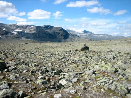 We volgen het pad verder, tot we aan de splitsing komen waar de weg over de Glittertind  begint. Ulrike en Wim besluiten de top de beklimmen (zie verder), en wij verkiezen de gemakkelijkere route omheen de bergtop. We nemen “afscheid” en wandelen verder door het dal.