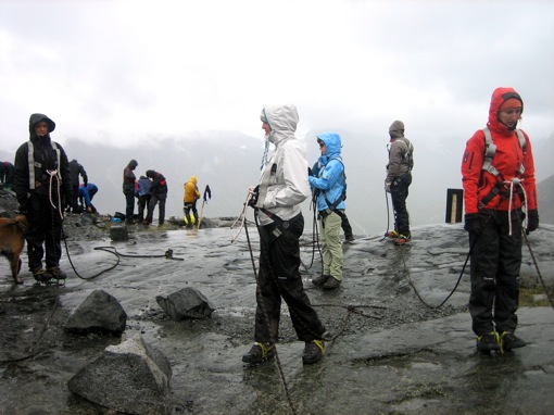 Met een uitgedund groepje – voor de gelegenheid het expeditieteam genoemd – maken we ons klaar voor de beklimming van de hoogste berg van Noorwegen: de Galdhoppigen. Met zijn 2372m hoogte staan we voor een klus van 1400 hoogtemeters over een afstand van een goede 5km. Recht omhoog dus. De mist en regen houdt ons niet tegen en algauw zeggen we vaarwel tegen de thuisblijvers -aka gletsjerwandelaars-, zetten we het verstand op nul en beginnen we meters te malen.