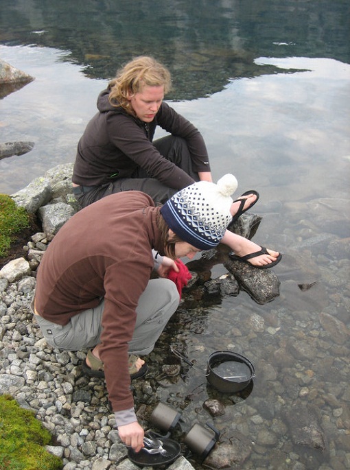 Sommigen doen een laatste effort en lopen even naar de hut, anderen proberen de afwas te doen in het gletsjermeer.