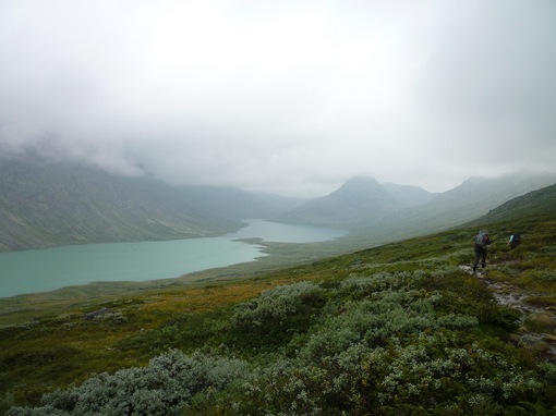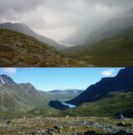 Na wat een eeuwigheid lijkt te duren, laten we het meer achter ons en beginnen we aan een volgende steile beklimming om het dal uit te komen. Het einde van de helling valt ons  zwaar, omwille van losse stenen en de hellingsgraad. We zijn moe en geraken moeizaam boven. Uiteindelijk komen we tot de splitsing die naar de Besseggen leidt. Op deze plaats zullen we de volgende dag terug komen om dan de weg naar Besseggen te kiezen. De foto hieronder toont dezelfde plaats, eenmaal met het slechte weer van vandaag en vervolgens met het prachtige weer de volgende dag.