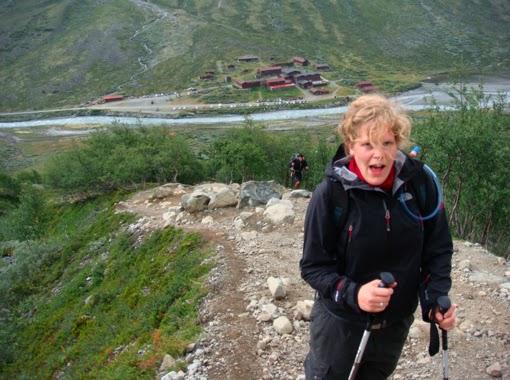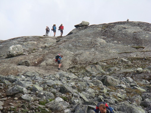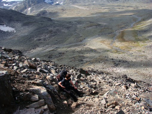 Na een aantal uren lang stijgen volgt de afdaling naar de plaats waar we zes dagen eerder zijn vertrokken: Gjende. Het is klauterwerk en we zijn duidelijk niet alleen.