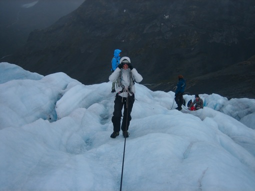 We doen de krampons rond onze schoenen en worden in kolonne vastgebonden aan het veiligheidstouw. De gidsen geven wat basisadvies voor het veilig betreden van een gletsjer. Het veiligheidstouw waarmee we allen verbonden zijn, mag niet te strak en niet te los hangen om te vermijden dat we, wanneer we in een crevasse zouden vallen, iedereen zouden meesleuren in de val. Als het touw goed hangt zou je voorganger of de persoon achter je in principe je val moeten breken. Mmmhh….