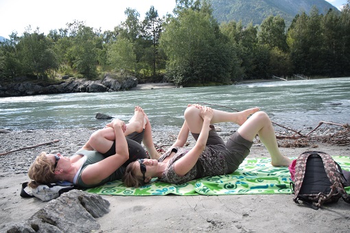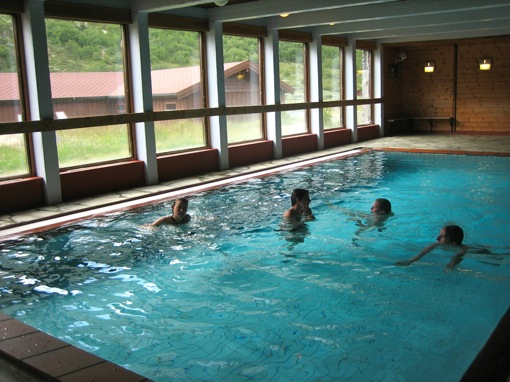 Na aankomst rusten we even uit, zetten we de tenten op aan de overkant van de rivier en haasten we ons naar de sauna en het zwembad van de hut. Na twee dagen stappen met zware rugzakken is dit een heerlijke ontspanning!