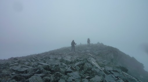 Op goed geluk en met een minimale zichtbaarheid banen we ons een weg omhoog. Af en toe passeren we een vertwijfelde hiker die zich wellicht net als ons afvraagt of verder gaan een goede optie is. We laten ons echter niet van de wijs brengen en geraken ook over de tweede top, de Keilhaus Top.