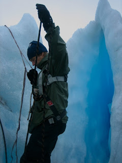 De gletsjer krijgt steeds meer reliëf en we begeven ons midden in de blauwe ijsformaties. Met hulp van een touw en het verticaal plaatsen van de crampons klimmen we over een ijsmuur heen. Gelukkig krijgen we wat hulp van de gids!