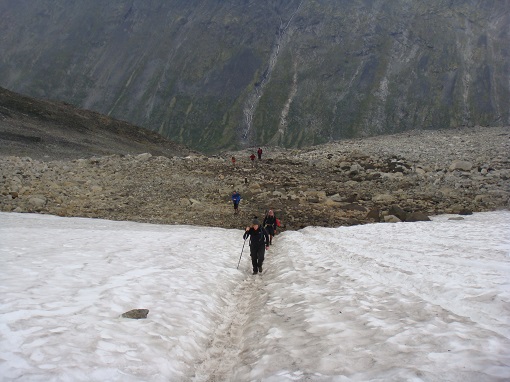 Na een spannende tocht op de gletsjer starten we aan de afdaling, alweer een vreemde gewaarwording om recht naar beneden te staan en stevige stappen te zetten zonder uit te glijden op de spekgladde ondergrond. We beginnen het gletsjerwandelen onder de knie te hebben!