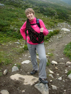 Het pad gaat steil omhoog, eerst door lage vegetatie maar wat verder zijn er enkel nog stenen en mos. Al gauw zien we de hut in het dal liggen, maar voor ons wordt alles steeds mistiger.