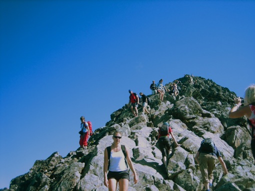Samen met de vele anderen klimmen we ons een weg naar boven. Het pad vereist soms echt klauterwerk en is niet bepaald geschikt voor mensen met hoogtevrees. In tegenstelling tot gisteren genieten we van een stralende zon. Enkel Wim zal ze nog vervloeken, wanneer nadien blijkt dat hij een zonneslag heeft opgelopen.