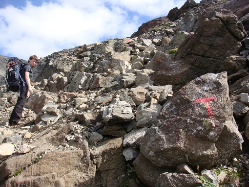 We beginnen zonder al te veel na te denken aan de klim, maar ik krijg al snel evenwichtsproblemen omwille van mijn zware rugzak. Wim klautert voorop en vraagt af en toe of het nog gaat. Wat een vraag, na elke loodzware helling duikt de volgende loodzware helling op. Na die loodzware helling is daar alweer de volgende. Ik ben kwaad op mijn lichaam en scheld het in actie. Mijn ogen beginnen te zweten.