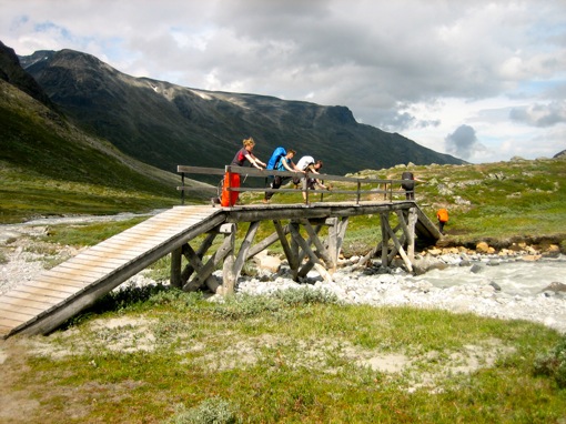 We dalen in de richting van het grote Russvatnet meer, en nemen de lange, hoge hangbrug boven de Blåsjönnåe rivier.
