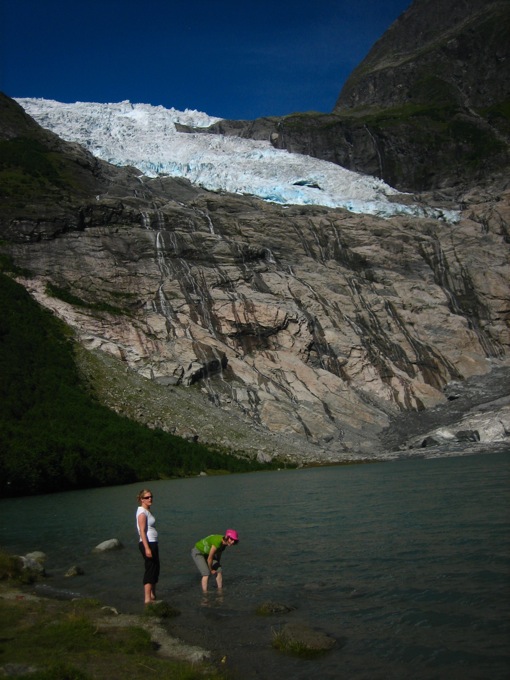 We naderen Jostedalsbreen, de grootste gletsjer van Europa (490 m2 !) en stoppen aan Boyabreen, één van de vele zijarmen van de gigantische gletsjer waar geregeld ijsverschuivingen voorkomen. We blijven even hangen aan het gletsjermeertje en sommigen onder ons wagen zich in het ijskoude water.