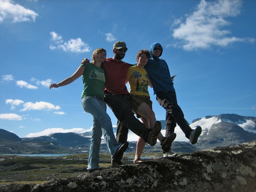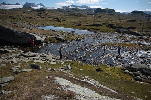 Wanneer de tenten opgeplooid zijn en de auto’s wat opgeruimd, rijden we verder langs de Sognefjellet Road, een prachtige toeristische route doorheen de Noorse bergen. Met de walkie-talkies communiceren we met de andere auto en laten we onze luide muziek horen: California Dreaaaaming tralalalaaaaaa. We stoppen meermaals langs de weg en houden heuse fotoshoots in de prachtige omgeving.