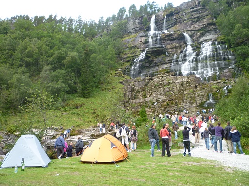 Na nog wat rijden komen we toe in de stad Voss. We doen er inkopen in de COOP en gaan op zoek naar de camping. Eenmaal we op de camping zijn, vinden het er maar niets: midden in de stad en totaal ongezellig. Uiteindelijk rijden we terug noordwaarts en belanden we aan de camping Tvinde, gelegen aan de Tvindefossen waterval. Ondanks het luide gebrul van de waterval besluiten we hier onze tentjes op te zetten. Kamperen aan een waterval, het heeft wel iets.