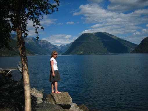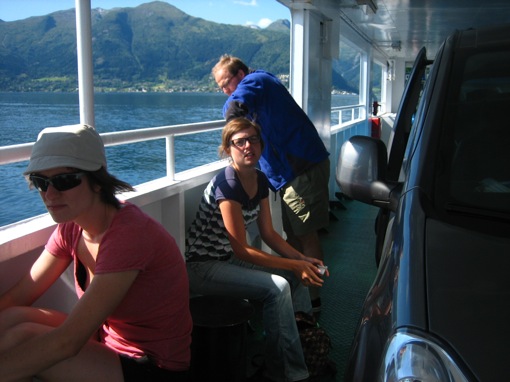 In Dragsvik nemen we de ferry naar Vangsnes. Het hele ferry-gebeuren duurt nogal lang: wachten op de volgende ferry, aanschuiven, oprijden, oversteken, er weer af rijden… het neemt al gauw een uur in beslag. Gelukkig kunnen we ondertussen van de omgeving genieten.