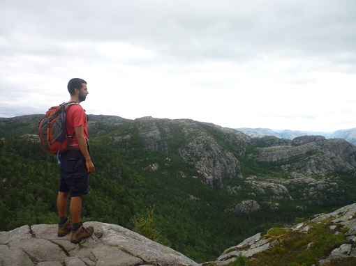 Na meerdere overzetboten komen we rond 15u00 eindelijk toe aan de Preikestolen hut. Vanuit de hut is het 4 km wandelen tot aan de Preikestolen, een indrukwekkende plateaurots die 604m boven het Lysefjord uitsteekt. We trekken onze wandelschoenen aan en vullen een dagrugzakje met water, koekjes en regenkledij.