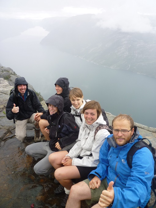 Helaas hebben we niet zoveel chance met het weer, want wanneer we na anderhalf uur de Preikestolen bereiken is het gaan regenen. De laatste meters zijn behoorlijk glad en met de heuse afgrond links zijn we toch blij dat er een touw is om vast te houden.