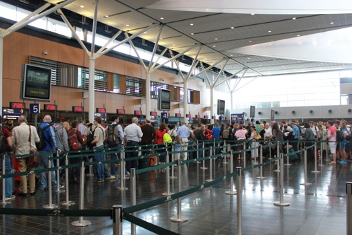 Vandaag is de grote vertrekdag. We staan vroeg op en vertrekken rond 7h00 naar het vliegveld van Zaventem waar we, dankzij een toegewijde ‘vrijwilliger’, worden afgezet aan de departure-hall. Het is even slikken wanneer we onze zakken proberen meesleuren: we dragen elk een grote trekrugzak van een 12 à 15-tal kg (met kleren, kookgerief, mattekes en slaapzakken) op de rug en een bijna even zware rugzak op de buik (met de reisboeken, leesboeken en andere zware rommel). Daarnaast draag ik nog een fototas met mijn splinternieuwe Canon EOS D550 rond de schouder.