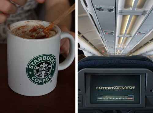 Nadat we de nodige croissants en fruitsap hebben gekocht, checken we in voor onze vlucht met Air Canada. Onze rugzakken bergen we op in een flightbag en geven we met veel plezier af. Aan de gates genieten we van een Starbucks-koffie om in de Seattlesfeer te komen en eten we ons ontbijt op. Ulrike heeft zich blijkbaar vergist en de vlucht vertrek een uur later dan gedacht, we hebben dus zeeën van tijd om wat te lezen over Seattle.