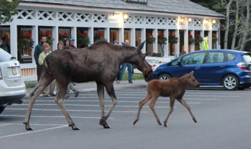 Nog geen twee seconden later merken we nogal wat commotie rond de parking. Ik denk meteen aan die beer, maar gelukkig blijkt de commotie niet door een beer, maar door een moose en baby moose veroorzaakt te zijn. We houden braaf afstand en genieten van het zicht van twee enorme beesten die we nooit eerder zagen.