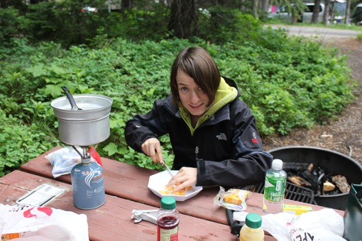 Eenmaal we opgewarmd zijn keren we terug naar de camping en koken we een pittige chili con carne.