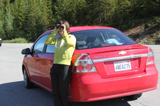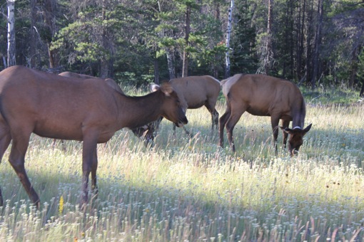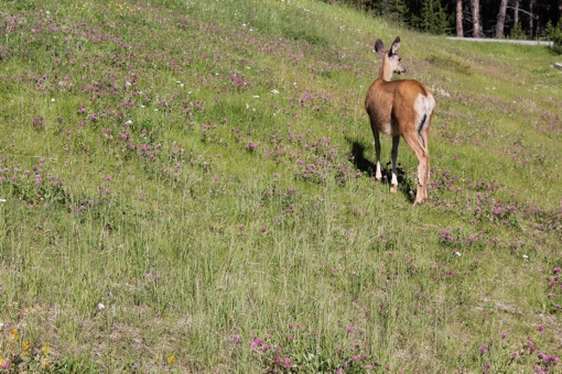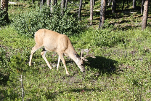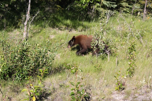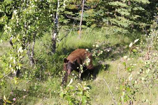 We hebben geluk want onderweg zien we een whitetail deer, enkele geiten, een baby-grizzlybeer en nog wat herten. Het blijft echt adembenemend om een beer te zien grazen in de berm op nog geen drie meter afstand… !