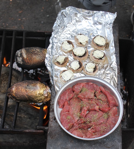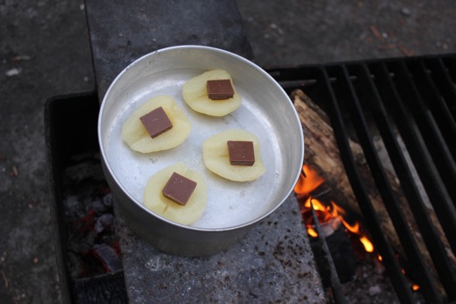We koken voor het eerst op het kampvuur (en niet met het campinggaz-vuurtje) en maken steak, gevulde champignons en aardappelen met peer en chocolade als dessert.