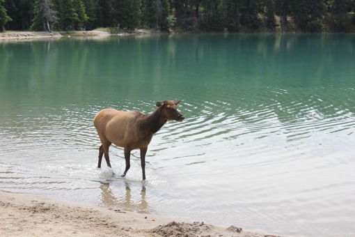 Plots komt een Wapiti (of is het een Mule Deer?) via het water naar ons toe. Het wild dier komt steeds dichterbij en we gaan eventjes uit het water om het te laten voorbijgaan. Wat een scène: zwemmen met een wild hert vlakbij in het water !