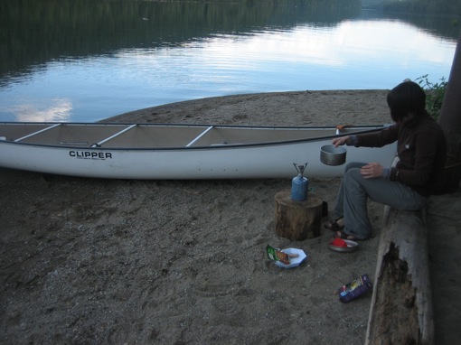 We varen terug naar onze tent en koken soep en chili con carne op een houtstronk op ons strandje. We genieten van de zonsondergang en van de stilte. De weinige kanovaarders keren terug naar het startpunt en we blijven als enigen over aan de oever. Twee mannen nemen wat verderop een plekje in maar we horen en zien ze niet en hun aanwezigheid stelt ons stiekem toch een beetje gerust.