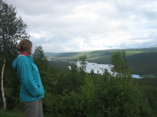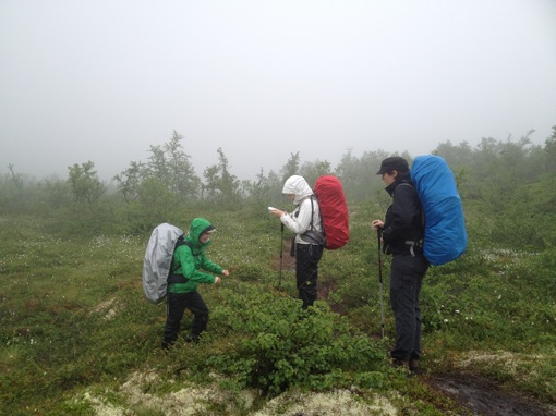 We wandelen door de moerassen en vinden nieuwe wegen omheen de ondergelopen paden. We herkennen de sneeuwvelden en de rivieren die we de dag voordien ook al overstaken. Wanneer we uit het dal zijn en bovenop de Hallaskarhalsen staan hebben we eindelijk terug gsm-bereik en lukt het om Wim en Jo te bereiken. Blijkbaar zijn zij onderweg naar de auto. We spreken af dat ze ons in Vivelid zullen opwachten. Wat een geruststelling om te weten dat ze deze weg niet voor niets hebben genomen en al terug zijn gekeerd!