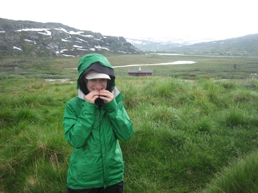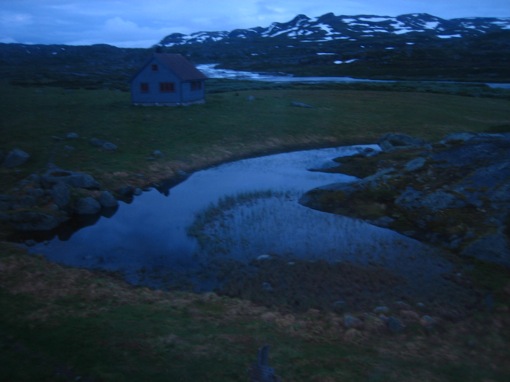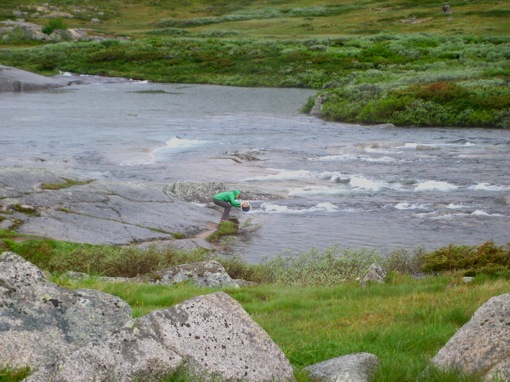 We kruipen door de jeneverbessenstruik tot aan een smal en ondiep stukje rivier, doen de schoenen uit en trekken de broekspijpen naar boven. Daar staan we dan met blote voeten op het sompige mos van de Hardangervidda. De muggen beleven de tijd van hun leven en aanschouwen ons als een unieke feestmaaltijd. Mijn enkels worden door wel 30 muggen aangevallen. Veel tijd om te treuzelen hebben we niet. Uli gaat voor en stapt door de rivier tot aan de overkant. Ik volg haar en jammer me een weg door het ijskoude water. Eenmaal de rivier over beseffen we dat we vergeten zijn onze sandalen te gebruiken. En zeggen dat we die speciaal hebben meegesleurd voor dergelijke doorwadingen! Aangezien we nog steeds tussen de dichtbegroeide bessenstruiken en op het sompige mos staan, trekken we de sandalen alsnog aan. Een beetje verder vinden we het pad terug en nemen we even de tijd om de voeten te drogen en de schoenen terug aan te trekken zodat de muggen onze benen weer met rust kunnen laten.