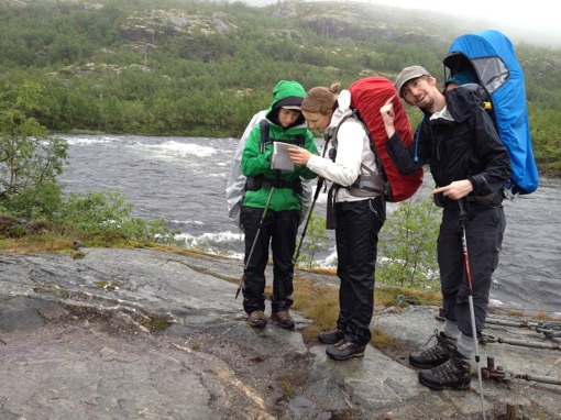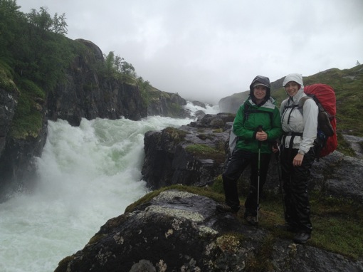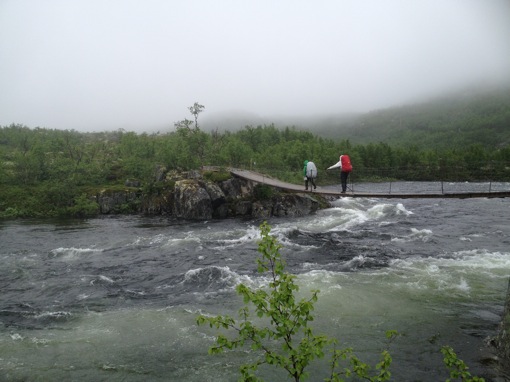 De paden zijn overal ondergelopen, maar dankzij de grote stenen op de paden kunnen we van steen tot steen “fjellhoppen” en droog blijven. Het is bijna 16u30 wanneer we aan de brug toekomen die ons over de kolkende Veig naar de hutten van Vivelid brengt. We komen er Wim tegen die ons tegemoet is gekomen en doen elk vol enthousiasme ons verhaal.
