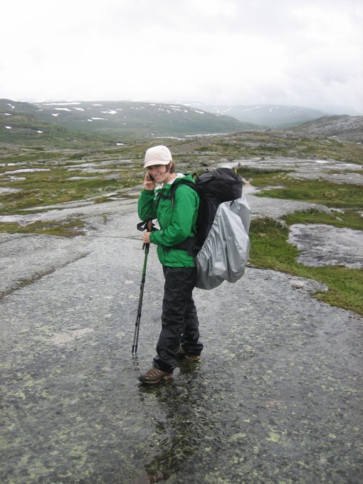 Met veel moed trekken Uli en ik de regensbroeken en – jassen terug aan en begeven we ons in de gietende regen. De tocht loopt verder langs de kolkende Veig en wijkt dan iets meer af over brede, platte rotsen. De weg gaat erg vlot en al lachend noem ik het pad de “autostrade van de Vidda”.