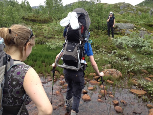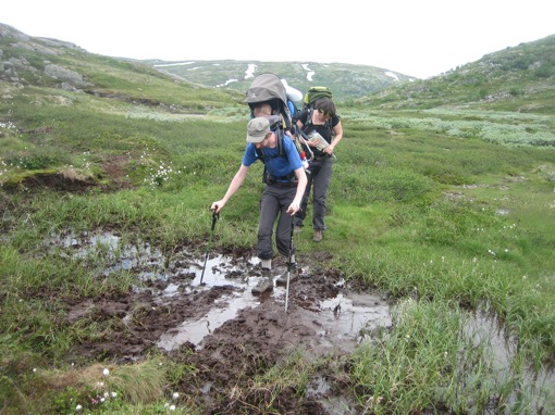 Na de korte pauze trekken we verder naar het Zuidoosten, door het dal. De vidda ligt er erg nat bij en we moeten steeds uitkijken waar we onze voeten plaatsen. Voor je het weet zak je tot aan je enkels door de drassige modder. We stappen van steen tot steen doorheen de moerassen. De wandelstokken bewijzen hun dienst en zijn een goede hulp om te testen hoe diep de modder wegzakt. Wanneer de stok tot over de helft in het moeras doorzakt is het toch even slikken en hopen dat je daar niet in terechtkomt. Voor Wim die de vrolijk wiebelende Oskar op zijn rug draagt, is het nog een pak moeilijker om zijn evenwicht te bewaren…