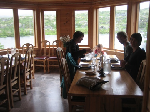 Na de uitgebreide maaltijd drinken we nog een thee’tje en lezen wat noorse boeken in de zitruimte van de bemande hut en sluiten de dag af met een partij’tje wiezen.