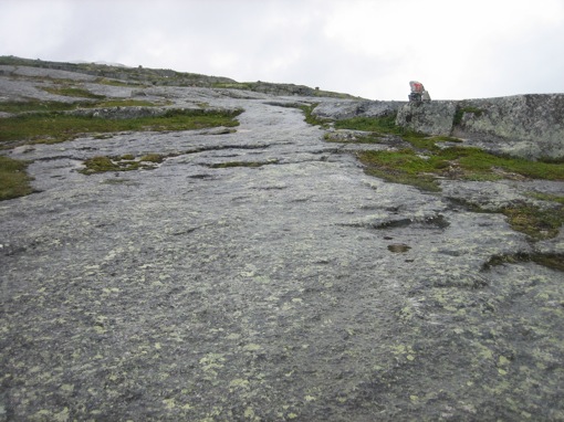 De stenen en rotsblokken maken plaats voor een platte rotsachtige ondergrond. Met de aanhoudende regen is de ondergrond gevaarlijk glad. Zeg maar spekglad.