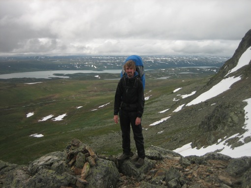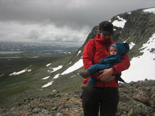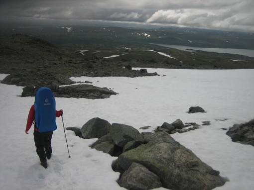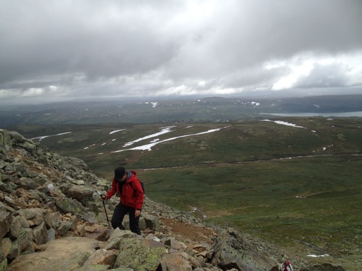 We houden iets hoger een korte lunchpauze en stappen dan verder naar de top. De beklimming is nu iets moeilijker omdat er geen treden meer zijn en ook geen pad: we klauteren over de stenen en rotsblokken de steile helling op. Voor Wim die de kleine Oskar op zijn rug draagt is het niet zo evident om zijn evenwicht te bewaren, maar hij geeft niet op en stapt voorzichtig tot aan het uitzichtpunt van de Prestholtskardet op 1660m hoogte. En het loont de moeite: we kijken uit over het Hallingskarvet National Park en zien in de verte alleen maar bergen, meren en sneeuw. Met mooi weer kun je hier zelfs de Harteigen van de Hardangervidda zien!