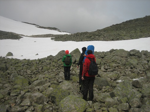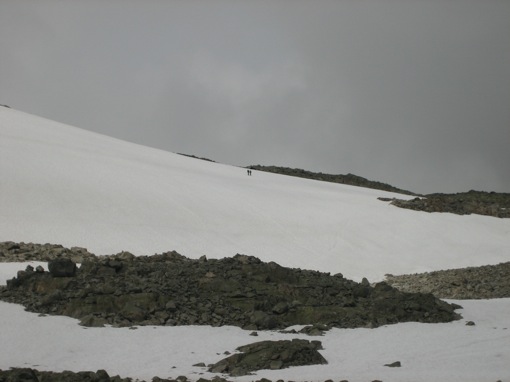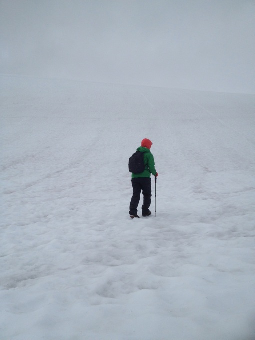 Voorbij de eerste top ligt een vlakte met enkel rotsen en sneeuw. We wagen ons door dit maanlandschap nog een stukje verder, ondanks het feit dat we geen steenmannetjes meer kunnen onderscheiden.