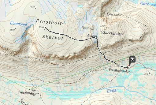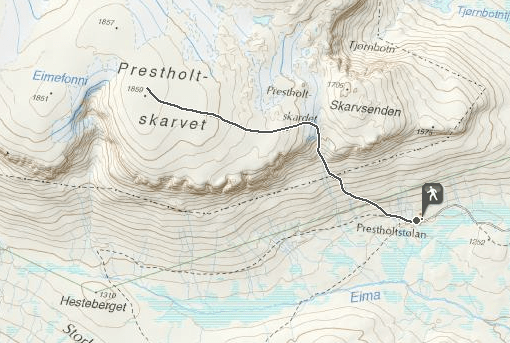 Vanaf de hut nemen we een goed aangelegd pad dat ons meteen al in de richting brengt van de Prestholtskarvet, naar boven dus.