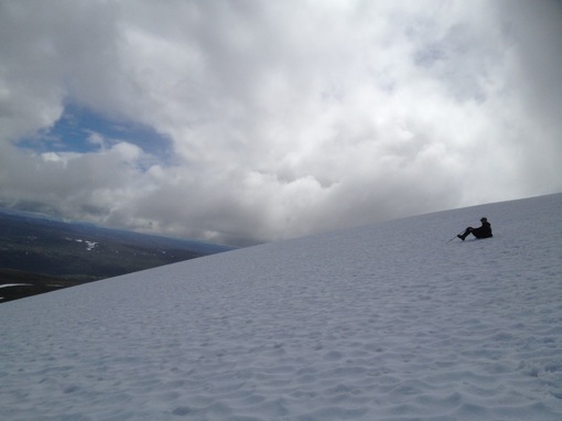 Op de terugweg vinden ze er niets beter op dan op de rugzakhoes de sneeuwhelling af te glijden. Die twee zijn toch ongelofelijk!