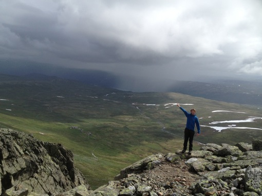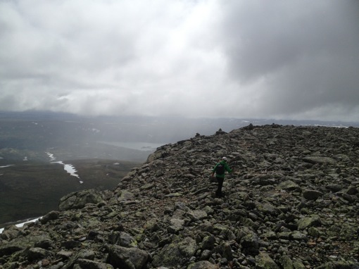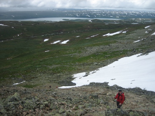 Op het programma van vandaag staat de beklimming van de Prestholtskarvet. De weersvoorspellingen zijn niet zo goed, en wanneer we opstaan is de lucht nog steeds bewolkt. Niet ideaal, want de top van de Hallingskarvet-bergketen kan wel eens verraderlijk blijken wanneer het mistig is: er is op zich al geen pad maar als de mist ook nog het zicht beperkt kan je makkelijk verdwalen.De Hallingskarvet is een steil aflopende bergrug van 35km lang en tot 5 km breed dat deel uitmaakt van het Hallingskarvet National Park en van Geilo tot Finse loopt. Aan de ene uiteinde ligt de top van de Prestholtskarvet, een relatief makkelijk te bereiken uitzichtpunt op 1855m hoogte. De tocht naar de top van Prestholtskarvet is zo langzamerhand uitgegroeid tot een “nationaal park-klassieker”.