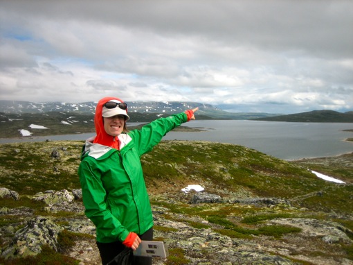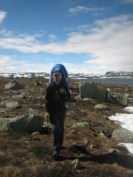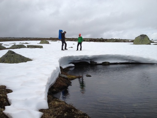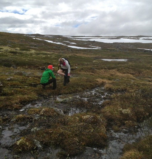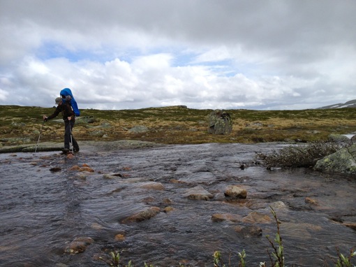We bevinden ons alweer midden in de typische sompige mossen van de Hardangervidda en doen ons best om niet in de modder en slijk weg te zakken. Dat lukt zonder problemen, tot ik een sprong maak over een modderpoel en uitglij op een steen: ik kom met benen en armen terecht in de koude modderpoel. Gelukkig hou ik er enkel een vuile en natte broek aan over en schieten we allemaal in de lach. De vuilste broekspijp trek ik uit om te laten drogen aan de lucht, en zo komt het dat ik verder wandel met maar één broekspijp aan. Nog een geluk dat we hier toch niemand tegenkomen!
